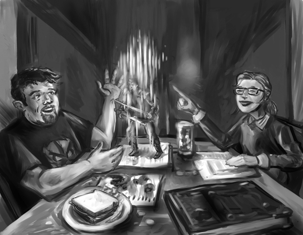 The interior artwork tells three stories: the story of the fictional gaming group used in examples throughout the book, the story of their fantasy campaign, and the story of their sci-fi campaign. These previews should give you a bit of a feel for where those stories go.